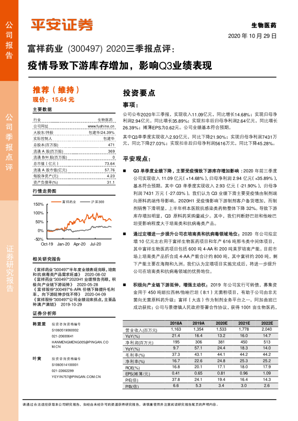 盈利预测与投资评级:公司主要品种竞争格局良好,产品储备持续丰富,积极向产业链下游延伸升级打开成长空间。考虑到Q3单季度业绩下降,下游库存需要一定时间消化,我们将公司2020-2022年归母净利润预测下调至分别为3.81亿、4.50亿、5.13亿元(原预测为4.01亿、4.73亿、5.40亿元)的预测,相应EPS调整为0.81元、0.96元和1.09元(原预测为0.87元、1.02元、1.17元),当前股价对应2021年PE为16倍,公司在特色原料药标的中估值性价比突出,维持“推荐”评级。
