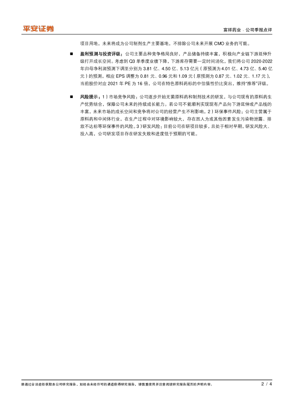 风险提示:1)市场竞争风险:公司逐步开始无菌原料药和制剂技术的研发,与公司现有的原料药生产优势结合,保障公司未来的持续成长能力。若公司不能顺利实现现有产品向下游延伸或产品线的丰富,未来市场的成长空间和竞争将对公司的经营产生不利影响。2)环保事件风险:公司主营属于原料药和中间体行业,在生产过程中对环境影响较大,存在因人为或其他因素发生污染物泄露、排放不达标等环保事件的风险。3)研发风险:目前公司在研项目较多,且处于相对早期,研发风险大、投入高,公司研发项目存在研发失败和进度低于预期的可能。