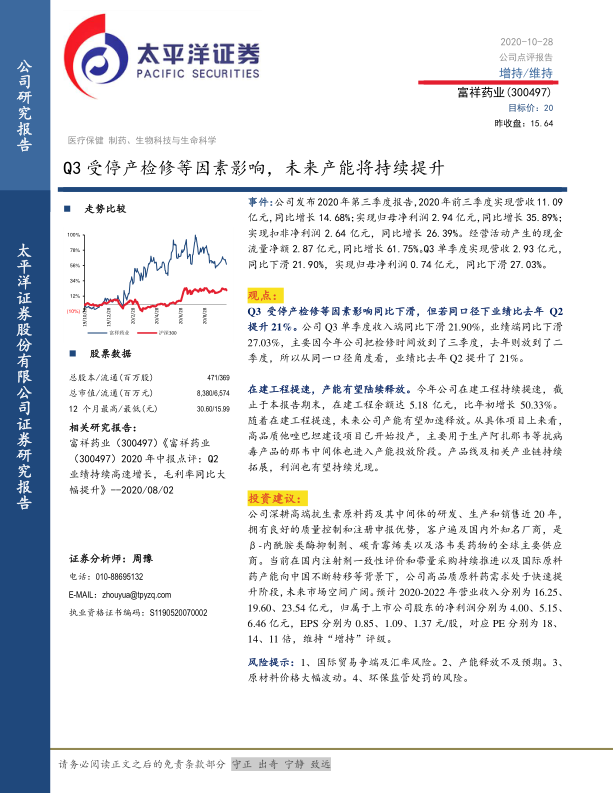 富祥药业Q3业绩虽受停产检修影响,但公司基本面稳健,在建工程提速,产能有望陆续释放。公司深耕高端抗生素原料药及中间体,具备质量控制和注册申报优势,受益于国内政策和国际产能转移,未来市场空间广阔。维持“增持”评级,建议关注。
