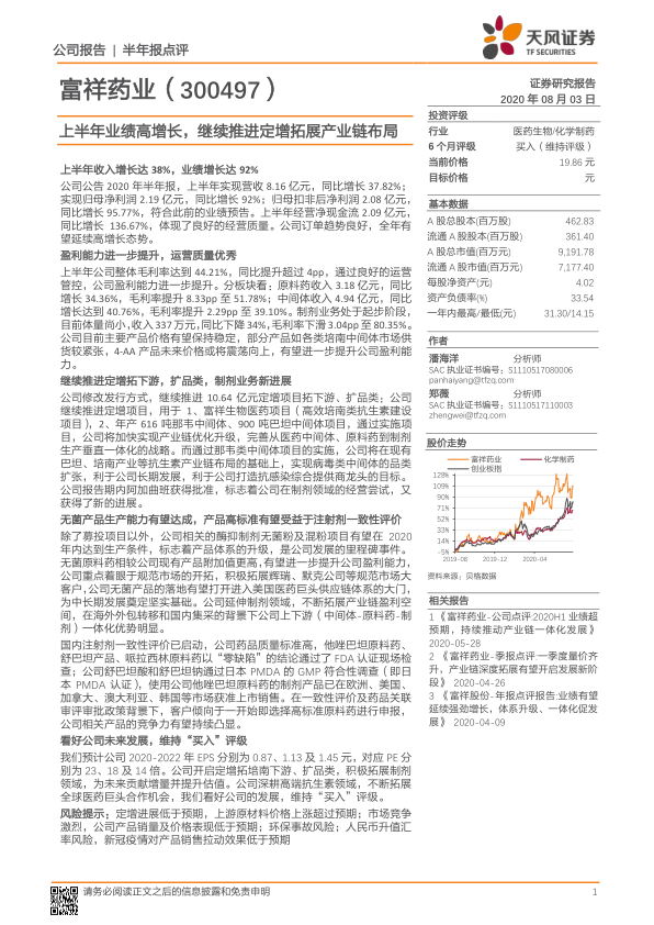 本报告对富祥药业2020年半年度报告进行了深入分析,核心观点如下:
