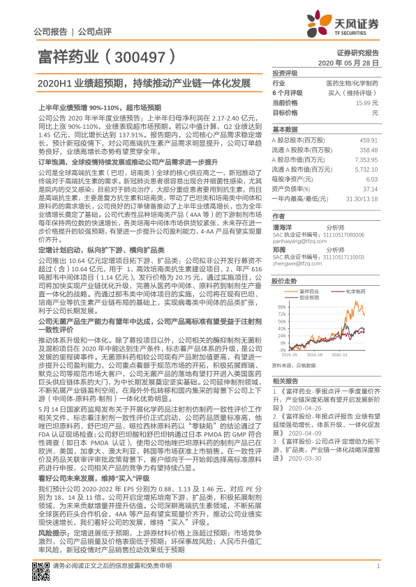 富祥药业凭借高端抗生素领域的优势,在新冠疫情的推动下,2020年上半年业绩大幅超出预期。公司通过定增项目,积极拓展产业链,提升产品质量标准,有望在未来的市场竞争中占据更有利的位置。天风证券维持对富祥药业的“买入”评级,并看好其未来的发展前景。