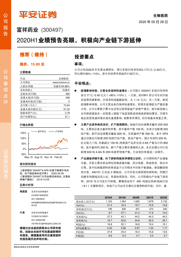 本报告的核心观点是富祥药业2020年上半年业绩预告亮眼,同比增长90%~110%,主要得益于疫情影响有限,主营业务保持快速增长。同时,公司积极向产业链下游延伸,增强主动权,未来成长空间广阔。