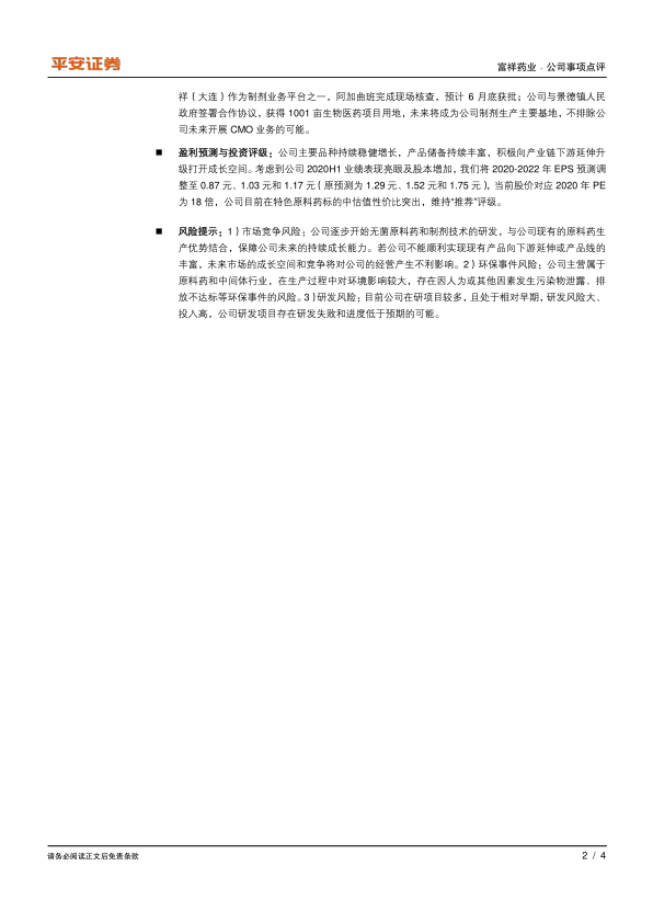 富祥药业2020年上半年业绩预告表现出色,主营业务稳健增长,产品储备丰富,并积极向下游制剂端延伸。公司主要产品竞争格局良好,扩产计划值得期待。平安证券维持对公司的“推荐”评级,认为其在特色原料药标的中估值性价比突出。但同时也提示了市场竞争、环保事件和研发等方面的风险。