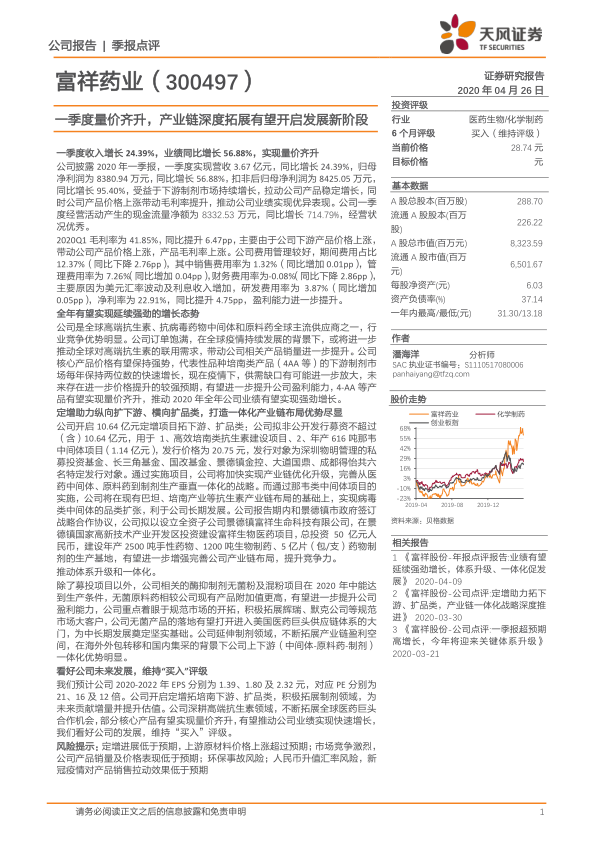 富祥药业一季度业绩表现亮眼,受益于市场需求增长和产品价格上涨。公司通过定增项目和战略合作,积极拓展产业链,并横向扩张产品品类,有望进一步提升市场竞争力。维持“买入”评级,并看好公司未来的发展前景。但同时也需关注定增进展、原材料价格、市场竞争、环保风险、汇率风险以及疫情影响等因素。