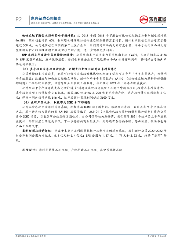 受益于主要产品利润贡献提升及新项目的逐步兑现,东兴证券研究所预计公司2020-2022年归母净利润分别为3.96亿元、5.10亿元和6.42亿元。对应的每股收益(EPS)分别为1.37元、1.77元和2.22元。基于此,维持“推荐”评级。