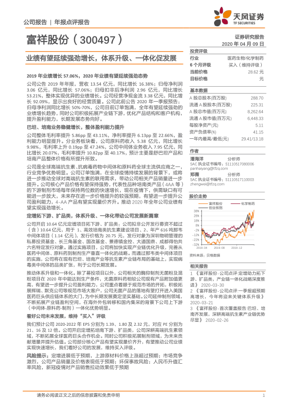 富祥股份2019年业绩表现亮眼,盈利能力显著提升。公司通过定增项目和体系升级,积极拓展产业链下游和优化产品结构,有望实现长期可持续发展。维持“买入”评级,并看好公司未来的增长潜力。