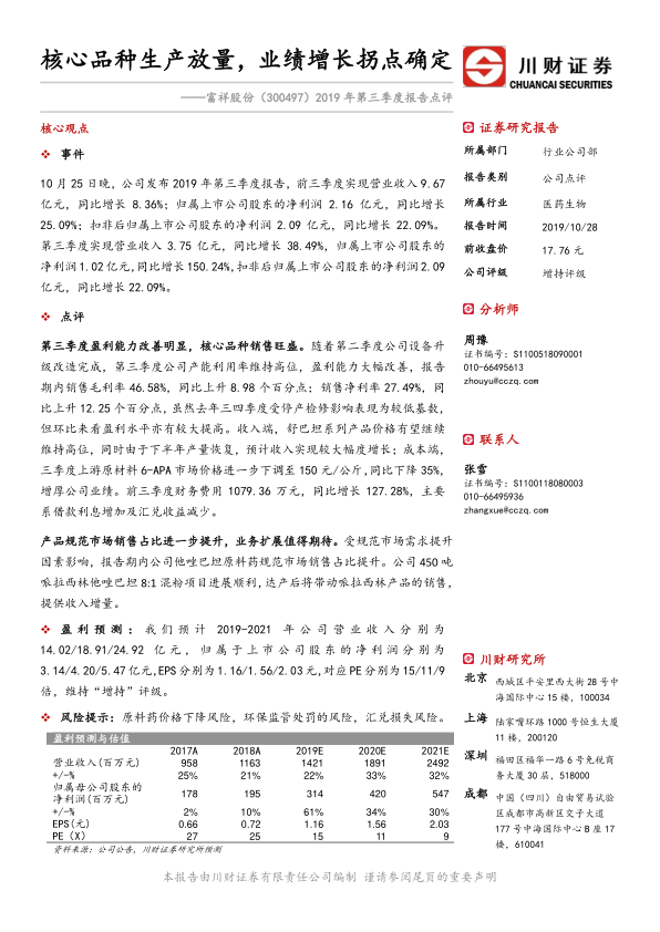 富祥股份2019年第三季度报告显示,公司业绩增长拐点确定,核心品种生产放量,盈利能力显著改善。产品结构优化和市场拓展为公司带来新的增长动力。维持“增持”评级,但需关注原料药价格波动、环保监管以及汇兑风险。