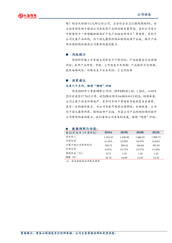 维持“增持”评级。结合三季报,调整19、20年EPS至1.10、1.28元,对应动态PE分别为16.09倍和13.92倍。短期内,公司主要产品受益于环保趋严和竞争对手停产,具有提价能力。长期来看,公司向下游延伸产业链,丰富产品结构,提升盈利能力。