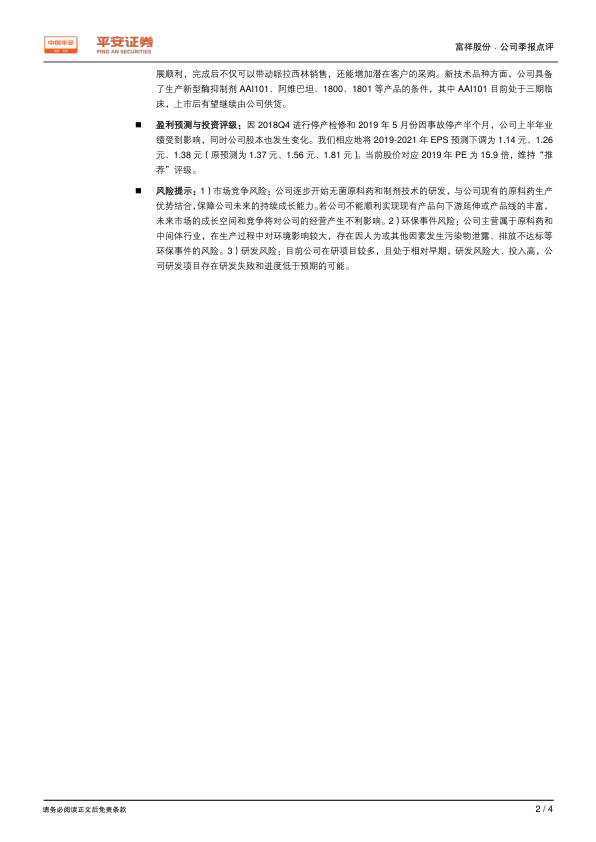 富祥股份2019年三季度报告显示,公司业绩迎来拐点,主要品种满产满销,叠加成本控制有效,盈利能力显著提升。主要产品受益于竞争对手产能受限,价格维持高位。公司积极拓展下游业务,他哌混粉项目和新技术品种储备有望带来新的增长点。平安证券维持“推荐”评级,但同时提示了市场竞争、环保事件和研发风险。总体而言,公司基本面良好,未来发展值得期待。