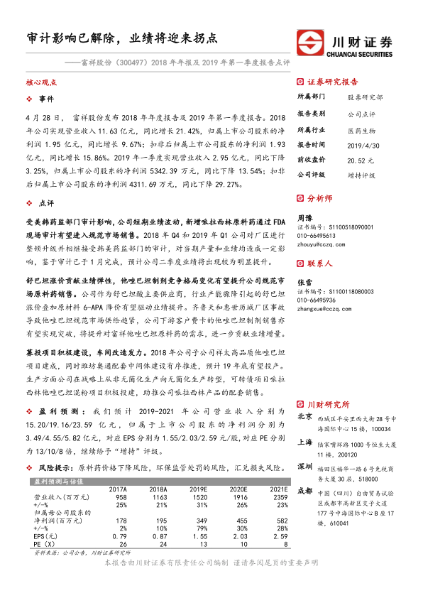 本报告对富祥股份2018年年报及2019年一季度报告进行了点评,认为公司在经历审计影响后,业绩将迎来拐点。报告分析了舒巴坦涨价、他唑巴坦市场格局变化以及募投项目建设等多重因素驱动下的增长潜力,并给出了盈利预测和“增持”评级。同时,报告也提示了原料药价格下降、环保监管处罚和汇兑损失等风险。