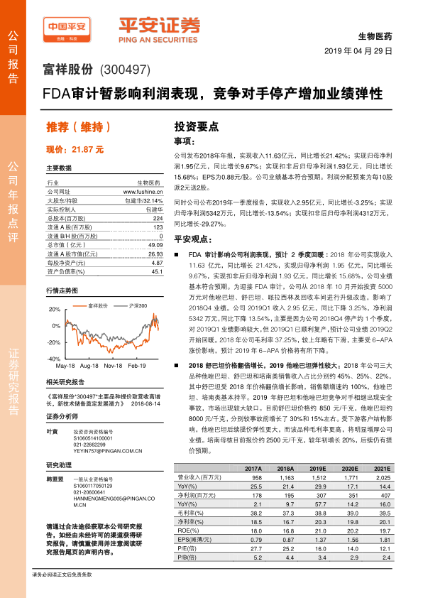 富祥股份2018年业绩基本符合预期,但受FDA审计影响,利润表现受到一定影响。不过,随着公司顺利复产,预计2019年二季度业绩将开始回暖。