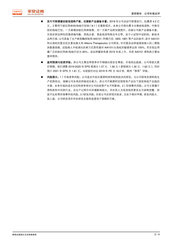 公司启动可转债发行,拟募资4.2亿元用于哌拉西林钠/他唑巴坦钠(8:1)无菌粉项目。未来公司将向费卡出售哌他混粉,代替目前的他唑巴坦,增加哌拉西林销售,提升产品附加值。公司新产品储备丰富,包括泰诺福韦酯、西他沙星、恩曲他滨和依法韦仑等。