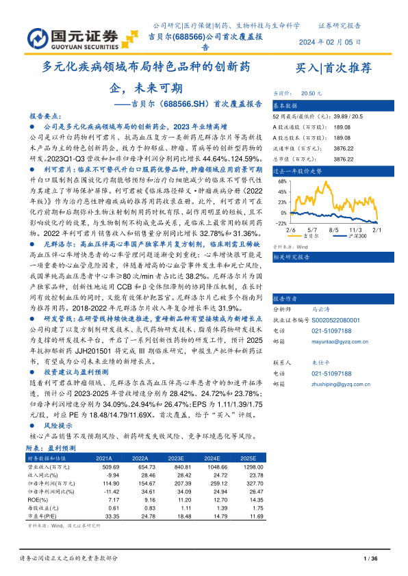 随着利可君在肿瘤领域、尼群洛尔在高血压伴高心率患者中的加速开拓渗透,预计公司2023-2025年营收增速分别为28.42%、24.72%和23.78%;归母净利润增速分别为34.09%、24.94%和26.47%;EPS为1.11/1.39/1.75元/股,对应PE为18.48/14.79/11.69X。首次覆盖,给予“买入”评级。