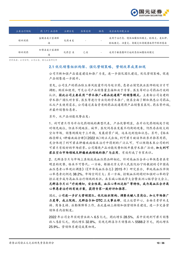 公司主要采用“学术推广+药品流通商”的销售模式,通过专业化学术推广提升医生对公司药品的认知。针对核心产品,公司积极开展学术推广活动。利可君片被《临床路径释义·肿瘤疾病分册(2022版)》推荐,进一步拓宽了其在肿瘤领域的应用。尼群洛尔片则针对高血压伴高心率患者(我国单纯高血压患者中38.2%心率≥80次/min)具有明显优势。公司通过扩大营销团队、成立院线、尼群洛尔和OTC三大事业部等改革措施,取得了显著成效。2022年,公司实现营业收入6.5亿元,同比增长28.5%;其中利可君片销售收入5.0亿元,同比增长32.8%;尼群洛尔片销售收入5588.2万元,同比增长25.9%。