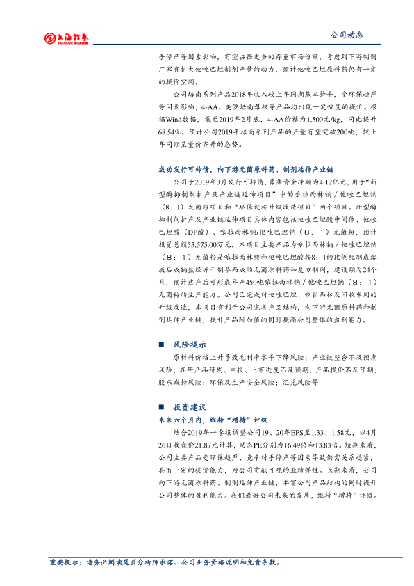 公司于2019年3月发行可转债,募集资金用于“新型酶抑制剂扩产及产业链延伸项目”和“环保设施升级改造项目”。该项目主要产品为哌拉西林钠/他唑巴坦钠(8:1)无菌粉,有利于公司完善产品结构,向下游无菌原料药和制剂延伸产业链,提升产品附加值。