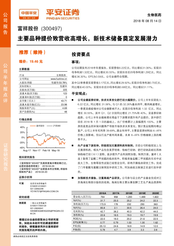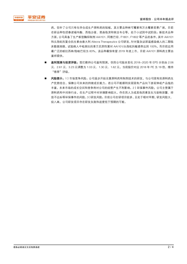 富祥股份2018年上半年业绩表现亮眼,营收和净利润均实现高速增长,主要得益于舒巴坦产品因市场供求变化而大幅提价。公司正积极实施战略转型,通过向下游延伸布局无菌原料药和制剂产品,以提升产品附加值和市场竞争力。同时,公司注重新技术储备和高端产品研发,通过投资江苏海阔生物拓展发酵工艺,并积极参与新型酶抑制剂AAI101等创新产品的开发,为未来发展注入新动力。尽管面临市场竞争、环保和研发等多重风险,但公司在产业链延伸和技术创新方面的努力,有望为其持续成长奠定坚实基础。