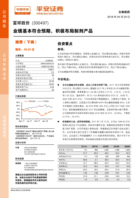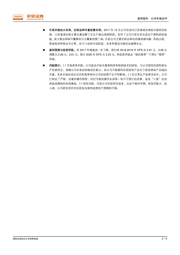 本报告分析了富祥股份2017年的年度报告,指出公司业绩基本符合预期,但受成本上升等因素影响,盈利能力有所下降。公司积极布局制剂领域,拓展业务范围,并通过外延并购增强实力,在研品种丰富,为未来业绩增长提供动力。报告同时提示了市场竞争、环保和研发等风险。
