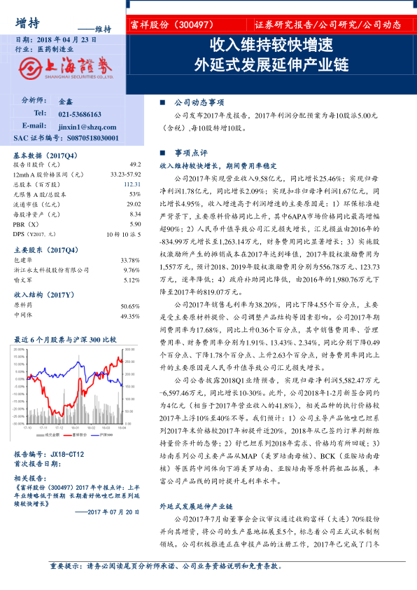 本报告分析了富祥股份2017年的经营业绩,指出公司收入保持较快增长,但受多种因素影响,利润增速低于收入增速。报告强调了公司通过外延式发展和参与并购基金等方式,积极拓展产业链,有望形成覆盖产业链的抗菌药物产品梯队,提高整体毛利率。同时,报告也提示了原材料价格上升、产业链整合不及预期等风险。最后,报告维持对公司“增持”评级,认为公司业绩有望走出低谷,逐步回升。