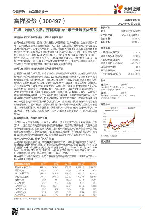 富祥股份作为高端抗生素产业链的领军企业,凭借其在巴坦类和培南类产品领域的优势地位、持续的技术创新和有效的成本控制,实现了业绩的快速增长。公司积极延伸制剂领域,为未来的发展注入了新的动力。考虑到新冠疫情带来的市场机遇、技术改造带来的能级提升以及核心原料价格下降带来的盈利能力提升,天风证券首次覆盖给予“买入”评级,并给出2020年目标价33.81元。但同时也需关注市场竞争、环保风险和汇率波动等潜在风险。