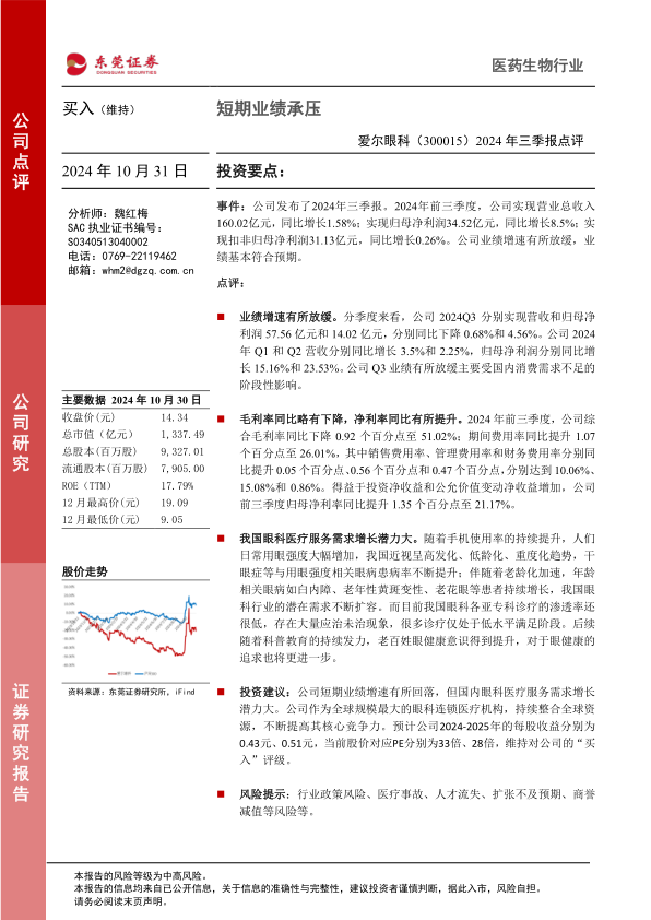 爱尔眼科2024年三季报显示,公司短期业绩增速放缓,但考虑到国内眼科医疗服务需求的巨大增长潜力,以及公司作为行业龙头的核心竞争力,维持对公司的“买入”评级。