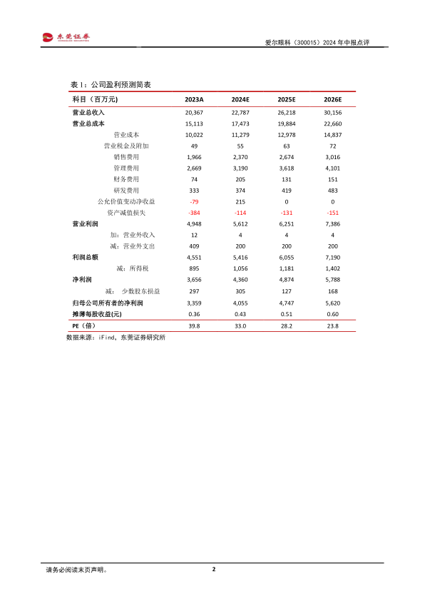 投资建议:公司短期业绩增速有所回落,但国内眼科医疗服务需求增长潜力大。公司作为全球规模最大的眼科连锁医疗机构,持续整合全球资源,不断提高其核心竞争力。预计公司2024-2025年的每股收益分别为0.43元、0.51元,当前股价对应PE分别为33倍、28倍,维持对公司的“买入”评级。