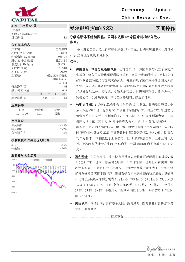 公司发布公告,拟以自有资金出资13.4亿元,收购重庆眼视光、周口爱尔等52家医疗机构部分股权。