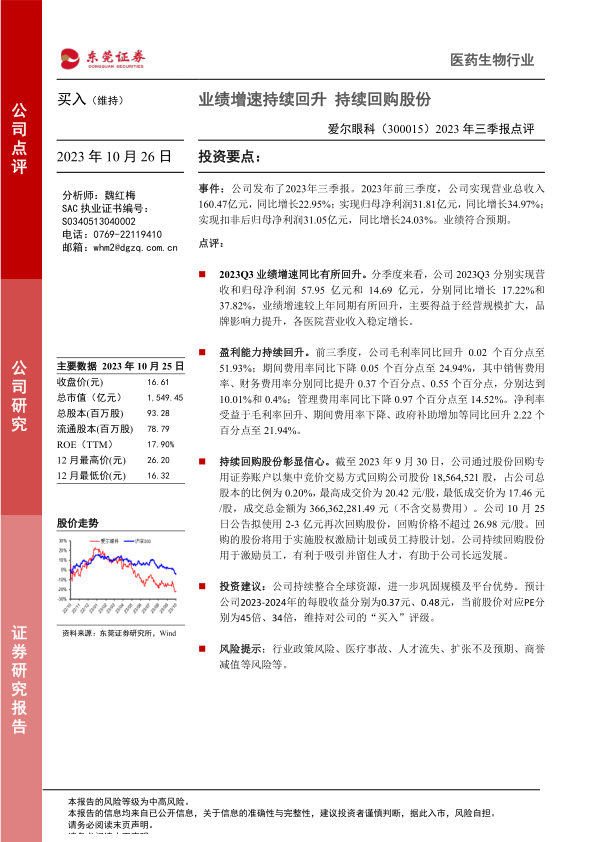 本报告对爱尔眼科2023年三季报进行了全面分析,公司业绩增速持续回升,盈利能力稳步提升,并通过股份回购计划彰显了对未来发展的信心。维持“买入”评级,建议投资者关注。
