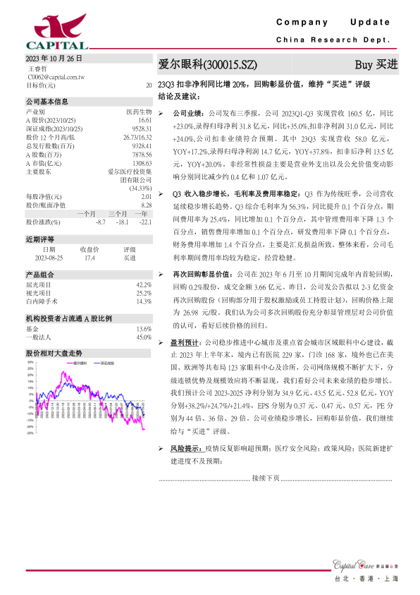 本报告对爱尔眼科2023年第三季度业绩进行了分析,指出公司营收和利润均实现稳健增长,扣非净利润符合预期。公司通过回购股份,彰显管理层对公司价值的认可。维持对爱尔眼科“买进”的投资评级,并预计公司未来几年净利润将持续增长,分级连锁优势和规模效应将不断显现。