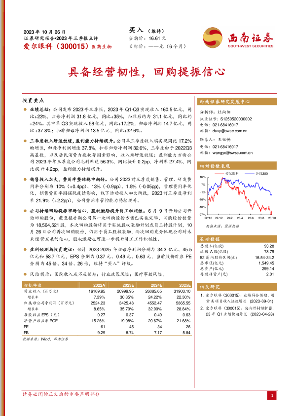 本报告分析了爱尔眼科(300015)2023年三季报,核心观点如下:
