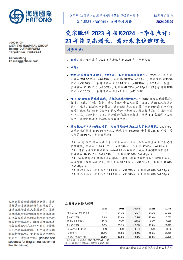 爱尔眼科2023年报&2024一季报点评:23年恢复高增长,看好未来稳健增长