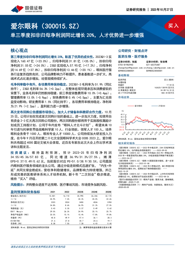 投资建议:维持盈利预测,预计2023-25年归母净利润34.55/45.36/57.83亿,同比增速36.9%/31.3%/27.5%;摊薄EPS=0.37/0.49/0.62元,当前股价对应PE=51.0/38.9/30.5X。公司是国内眼科医疗服务领域的龙头公司,通过分级连锁模式迅速扩张,“内生+外延”共同支撑业绩成长。营收净利稳健增长,品牌影响力持续增强,并已形成完善的医教研体系和人才培养机制,新十年“二次创业”稳步推进,维持“买入”评级。