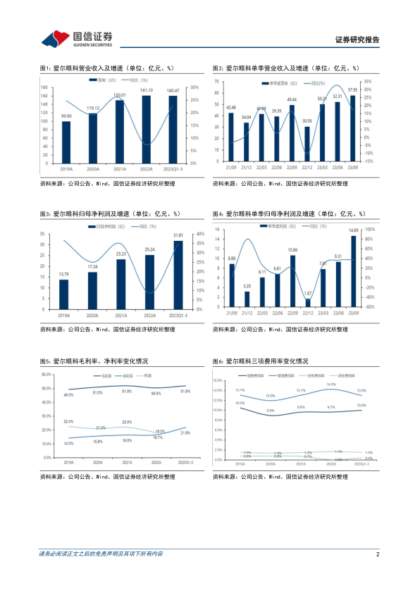 爱尔眼科在2023年前三季度展现出强劲的业绩增长和盈利能力提升,尤其在第三季度扣非归母净利润同比增长20.1%。公司通过持续扩大经营规模、优化高端术式占比、有效控制各项费用,实现了毛净利率的稳中有升。同时,公司积极通过股份回购提振市场信心,并推出“眼科人才北斗计划”以深化人才优势和科教研实力,为未来发展奠定坚实基础。作为国内眼科医疗服务龙头,爱尔眼科凭借其分级连锁模式和“内生+外延”发展战略,预计将继续保持稳健增长。国信证券维持“买入”评级,但提示投资者关注并购整合、医疗事故和市场竞争等潜在风险。