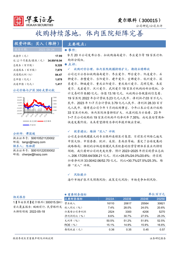 公司是全球规模最大的专业眼科连锁医疗集团,目前医疗网络已遍及中国大陆、中国香港、欧洲、美国、东南亚等地,奠定了全球发展的战略格局;独创的分级连锁模式及其配套的经营管理体系在业内持续领跑。我们看好公司的先发优势,预计2023~2025年将实现营业总收入206.17/255.64/308.21亿元,同比+28.0%/24.0%/20.6%;将实现归母净利润33.00/42.06/52.70亿元,同比+30.7%/27.5%/25.3%,维持“买入”评级。
