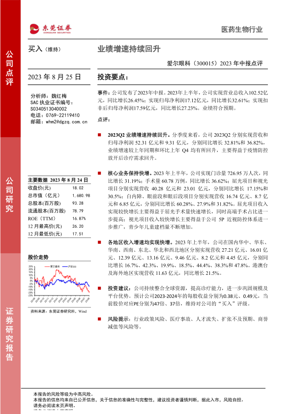 爱尔眼科2023年中报显示公司业绩增长强劲,核心业务稳健发展,各区域市场均实现快速增长。公司持续整合全球资源,提高诊疗能力,进一步巩固规模及平台优势。维持对爱尔眼科的“买入”评级,但需注意行业政策风险、医疗事故、人才流失、扩张不及预期、商誉减值等风险。