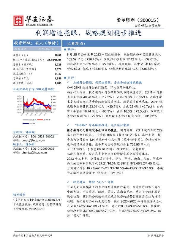 本报告对爱尔眼科2023年中期业绩进行了分析,并维持“买入”评级。核心观点如下: