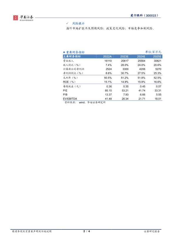 公司是全球规模最大的专业眼科连锁医疗集团,目前医疗网络已遍及中国大陆、中国香港、欧洲、美国、东南亚等地,奠定了全球发展的战略格局;独创的分级连锁模式及其配套的经营管理体系在业内持续领跑。我们看好公司的先发优势,预计2023~2025年将实现营业总收入206.17/255.64/308.21亿元,同比+28.0%/24.0%/20.6%;将实现归母净利润33.00/42.06/52.70亿元,同比+30.7%/27.5%/25.3%,维持“买入”评级。