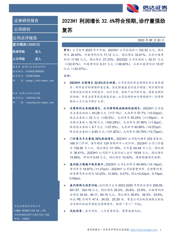盈利预测与投资评级: 我们预计公司 2023-2025 年营收分别为 208.09、261.67、 324.16 亿元,同比增长 29.2%、 25.8%、 23.9%,归母净利润分别为 34.54、 48.11、 64.74 亿元,同比增长 36.8%、 39.3%、 34.6%,对应 PE 分别为 47.4、 34.03、 25.29 倍,考虑公司分级连锁模式的成功及眼科疾病市场需求持续增长,维持“买入” 评级。