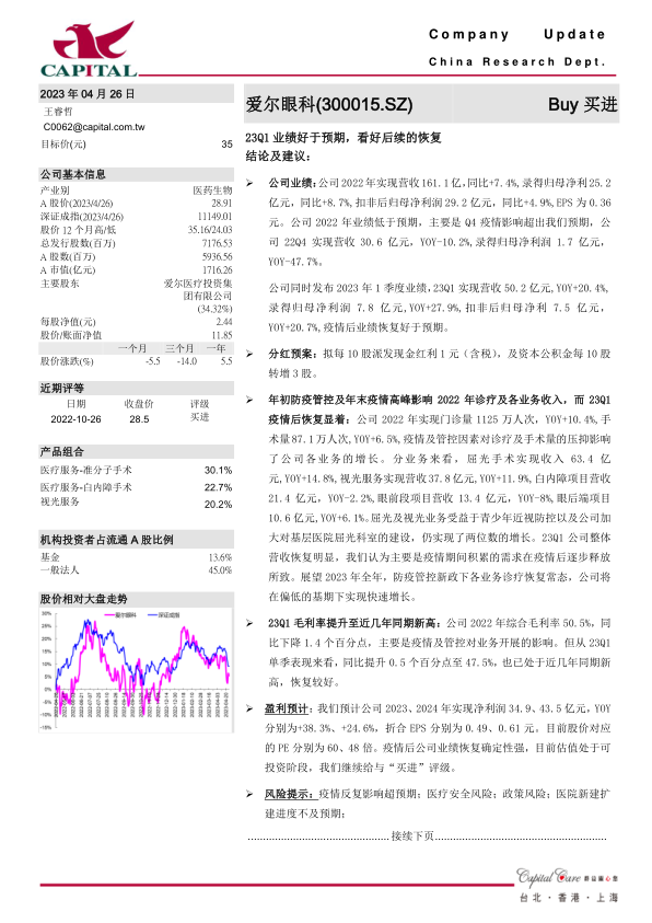 本报告分析了爱尔眼科2022年及2023年一季度的业绩表现,认为公司在疫情后恢复良好,尤其在屈光和视光业务方面表现突出。维持对公司“买进”的评级,并给出了盈利预测和估值分析,认为公司目前估值具有吸引力。同时,报告也提示了疫情、医疗安全、政策和医院建设进度等风险因素。