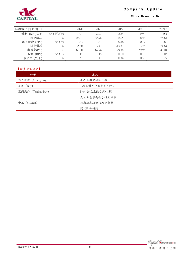 盈利预计:我们预计公司2023、2024年实现净利润34.9、43.5亿元,YOY分别为+38.3%、+24.6%,折合EPS分别为0.49、0.61元。目前股价对应的PE分别为60、48倍。疫情后公司业绩恢复确定性强,目前估值处于可投资阶段,我们继续给与“买进”评级。