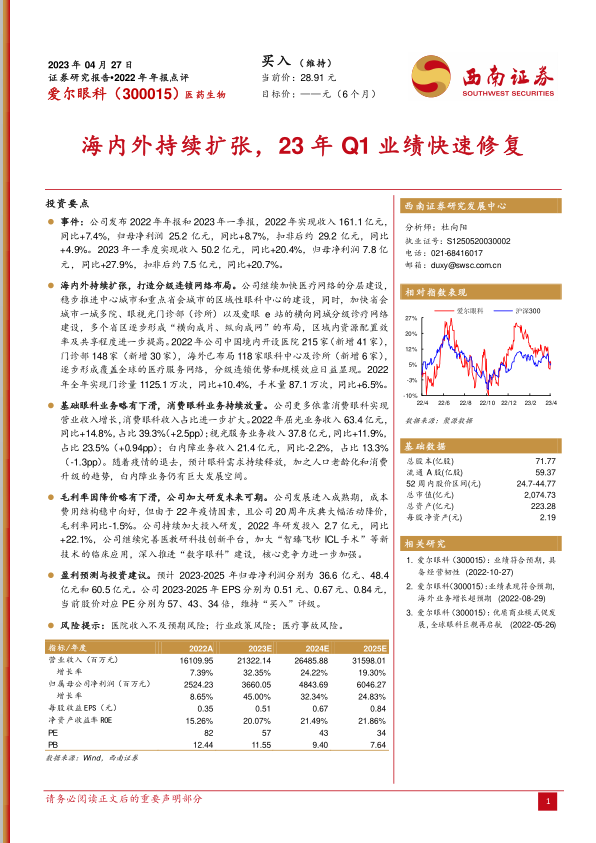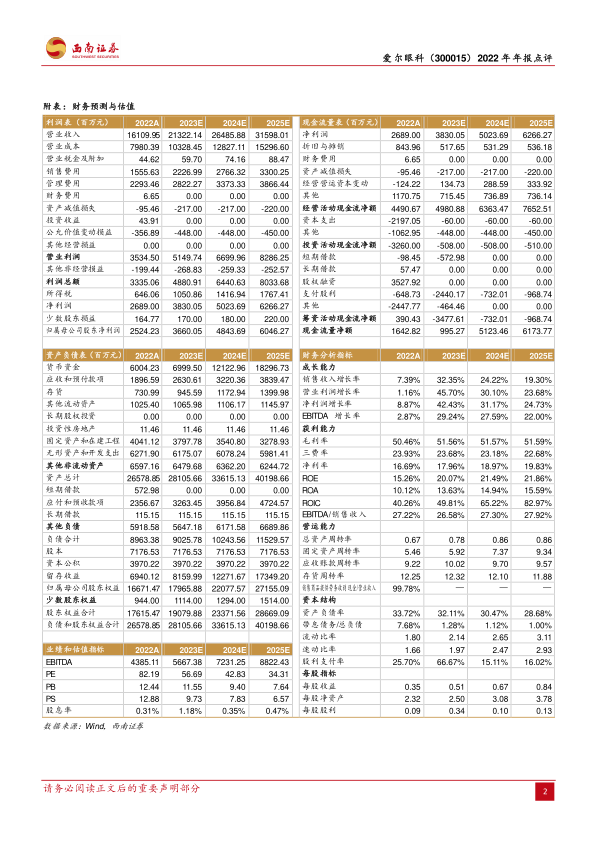 爱尔眼科在2022年实现了稳健的业绩增长,并通过积极的国内外扩张和分级连锁网络建设,进一步巩固了其市场地位。尽管面临毛利率下滑的挑战,公司通过加大研发投入和优化业务结构,展现了其长期发展的潜力。 预计未来几年,公司将继续受益于眼科需求的持续释放和人口老龄化趋势,实现盈利能力的进一步提升。