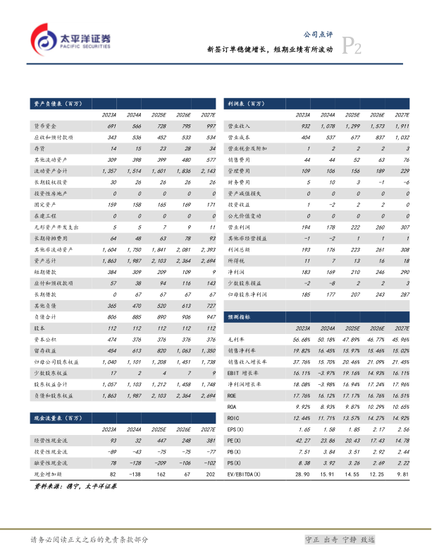 盈利预测与投资建议:我们预计2025年-2027年公司营收为12.99/15.73/19.11亿元,同比增长20.46%/21.09%/21.45%;归母净利为2.07/2.43/2.87亿元,同比增长16.94%/17.24%/17.96%,对应PE为20/17/15倍,持续给予“买入”评级。