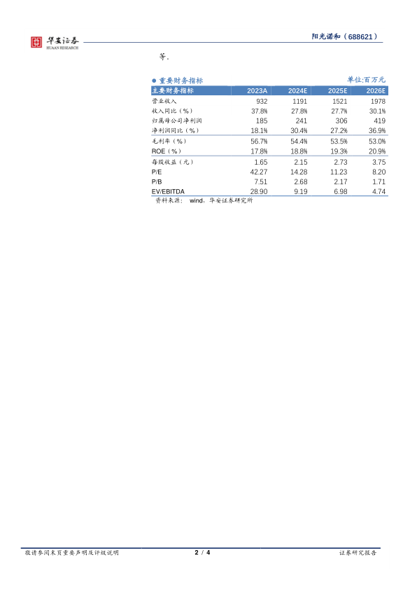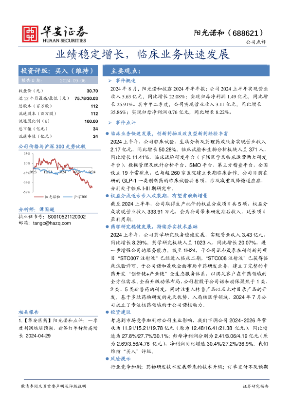 华安证券维持对阳光诺和的“买入”评级,但考虑到市场竞争加剧对公司主业的影响,下调了公司2024~2026年的营收和归母净利润预期。报告同时提示了行业竞争加剧、药物研发技术发展带来的技术升级以及订单交付不及预期等风险。
