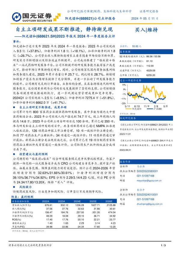 本报告对阳光诺和(688621.SH)2023年年报及2024年一季度报告进行了深入分析,核心观点如下: