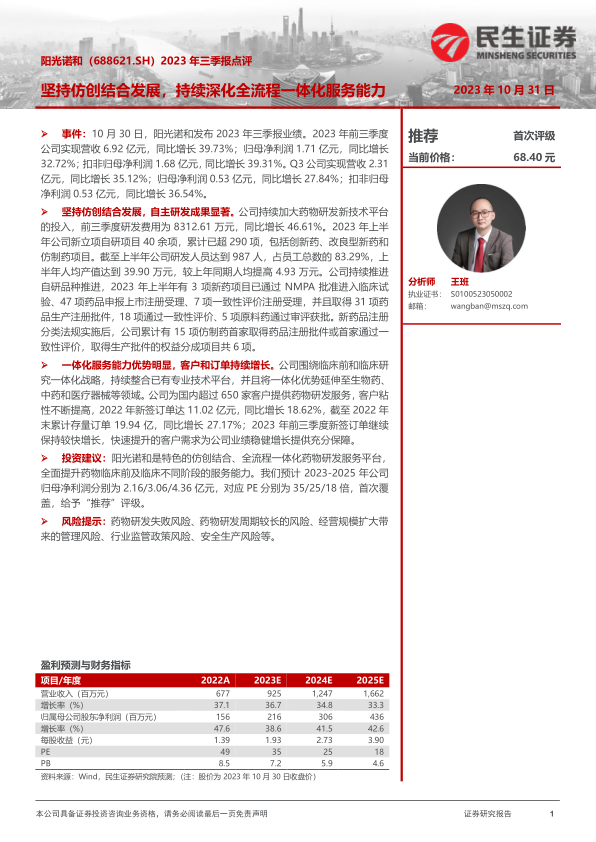 阳光诺和2023年三季报显示,公司业绩保持稳健增长,主要得益于其坚持仿创结合的发展战略和持续深化的全流程一体化服务能力。公司在自主研发方面投入力度大,成果显著,同时一体化服务优势明显,客户和订单持续增长。民生证券首次覆盖,给予“推荐”评级,看好公司未来的发展潜力。