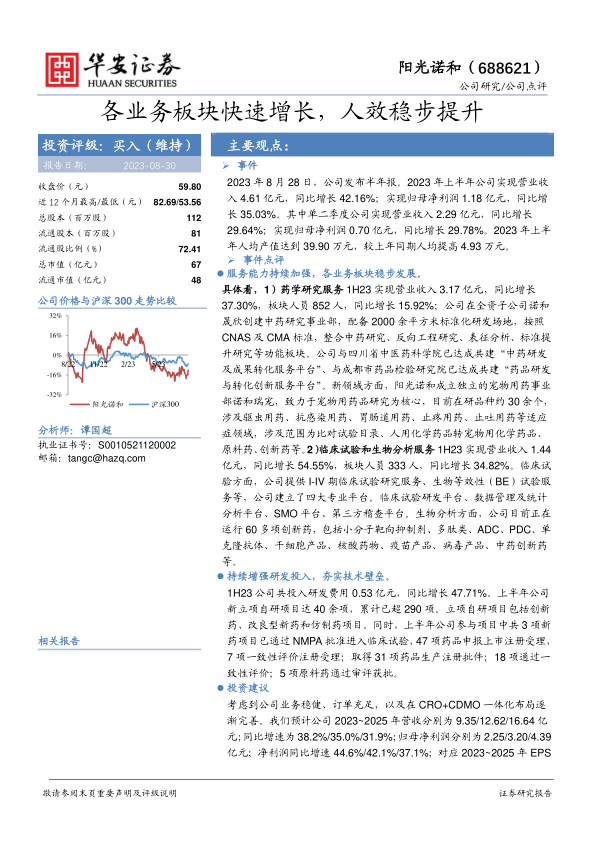 阳光诺和2023年上半年业绩表现亮眼,各业务板块均实现快速增长,盈利能力稳步提升。公司通过加强服务能力、拓展新业务领域和持续加大研发投入,不断夯实技术壁垒,为未来的可持续发展奠定基础。维持“买入”评级,看好公司未来的发展前景。
