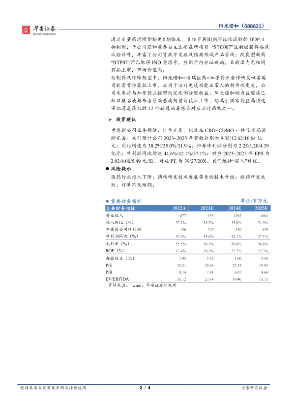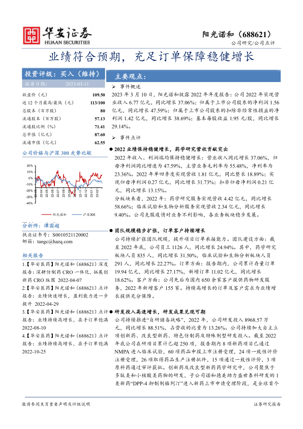 阳光诺和2022年业绩表现稳健,药学研究服务是主要增长动力。公司持续加大研发投入,创新药研发成果值得期待。在手订单充足,为未来业绩增长提供保障。维持“买入”评级,但需关注医药行业投入、技术升级、新药研发失败和订单不及预期等风险。