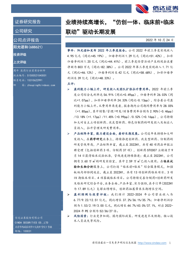阳光诺和在2022年前三季度实现了显著的业绩增长,收入和归母净利润同比增幅均超过45%,显示出强劲的发展势头。尽管公司持续加大研发投入和团队扩张,导致管理和研发费用率有所上升,但综合毛利率和归母净利率仍保持小幅提升,表明其核心盈利能力稳健。