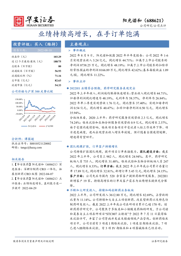 阳光诺和2022年上半年业绩表现亮眼,药学研究服务是主要增长动力。公司通过团队扩张和加大研发投入,不断巩固在仿制药CRO领域的优势,并积极拓展创新药CRO业务。维持“买入”评级,看好公司未来在创新药领域的增长潜力。