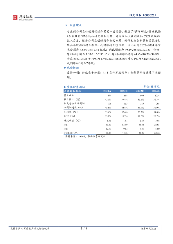 考虑到公司在仿制药领域积累的丰富经验,形成了“药学研究+临床试验+生物分析”综合药物研发服务优势,并逐渐加大在创新药CRO板块的投入力度,随着公司在创新药平台的布局,预计未来创新药相关服务订单具备较强的增长潜力。我们维持业绩预测,预计公司2022~2024年营收分别为6.88/9.33/12.34亿元;同比增速为39.4%/35.6%/32.3%;归母净利润分别为1.53/2.15/2.95亿元;净利润同比增速44.8%/40.7%/36.9%;对应2022~2024年EPS为1.91/2.69/3.68元/股;对应PE为54X/38X/28X。我们维持“买入”评级。