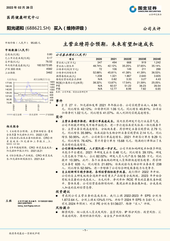本报告对阳光诺和2021年年报进行了深入分析,认为公司主营业务稳步推进,新签订单高速成长,业绩符合预期。公司持续加码研发,人才团队进一步扩充,自主创新项目稳步推进,各项经营指标逐步改善,展现出良好的经营态势。报告上调了公司未来盈利预测,维持“买入”评级,并提示了相关风险。总体而言,阳光诺和作为CRO行业的新星,未来有望加速成长。